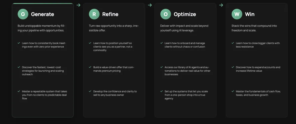 Overview : Grow AI helps entrepreneurs launch and scale successful AI arbitrage businesses. They provide the complete system—including training, tools, and support—to help clients generate high-paying AI service contracts, implement AI solutions for businesses, and scale their operations.